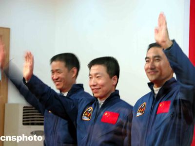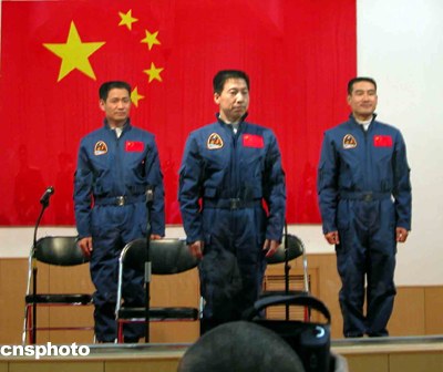 “神舟”五號載人飛船發射前夕,中國首次載人航天飛行航天員梯隊的三名航天員楊利偉(中)、翟志剛(右)聶海勝與記者見面,并回答記者提問。這也是中國航天員首次公開亮相。中新社記者孫自法攝