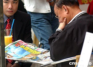 香港市民爭看號外。“神舟”五號飛船十月十五日順利升空,香港傳媒特發(fā)號外,圖為香港市民在街頭爭看號外。中新社記者:錢興強(qiáng)