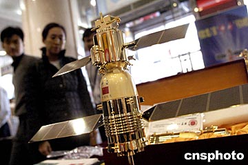 中國載人航天飛船“神舟”五號(hào)發(fā)射和回收取得圓滿成功后,北京王府井新華書店門口安放了制作精美的“神舟”五號(hào)實(shí)體模型,以標(biāo)價(jià)1000元人民幣進(jìn)行出售。中新社記者:鄒憲