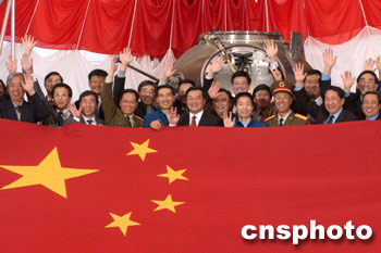 十月十八日,中國(guó)“神舟”五號(hào)載人飛船返回艙搭載物品開艙儀式在中國(guó)航天科技集團(tuán)公司北京空間技術(shù)研制試驗(yàn)中心舉行。隨載人飛船在太空翱翔二十多小時(shí)的巨幅五星紅旗從神舟五號(hào)載人飛船返回艙中被取出。中新社記者 張煒攝