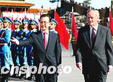 中國國務院總理溫家寶二十二日在北京舉行歡迎儀式,歡迎到訪的加拿大總理克雷蒂安。中新社記者:鄭萍萍