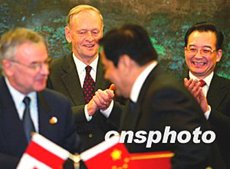 溫家寶總理與克雷蒂安總理出席簽字儀式。中新社記者:鄭萍萍