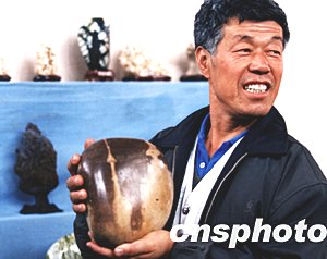 山西省垣曲有一位奇石收藏愛好著,不久前他在黃河小浪底水庫(kù)中發(fā)現(xiàn)了一顆圓石頭,石頭上有一個(gè)和“神州五號(hào)”載人火箭升空時(shí)的情景異常相似。2003年10月下旬,他為慶祝“神州五號(hào)”的發(fā)射成功,特將這塊奇石拿出來(lái)進(jìn)行展覽。張旦 攝