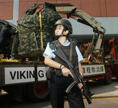 “神舟”五號載人飛船返回艙中午前由飛機運抵香港機場,現(xiàn)正等候送往科學(xué)館,準(zhǔn)備在航天展展出。圖為香港警察嚴(yán)密護衛(wèi)。