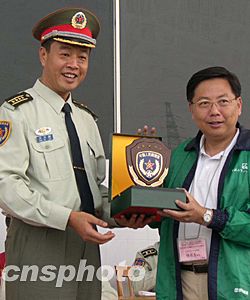 香港教育工作者聯會人士來到駐港部隊深圳基地參觀,圖為駐港部隊向該會贈送紀念品。中新社記者:黃少華