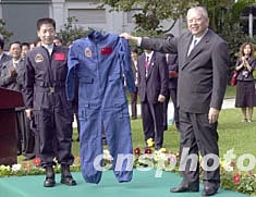 11月5日,香港特區(qū)政府在禮賓府舉行中國首次載人航天飛行代表團(tuán)歡送儀式,中國首位升空宇航員楊利偉向特首董建華致送他受訓(xùn)時所穿著的制服。中新社記者:鄧慶樂