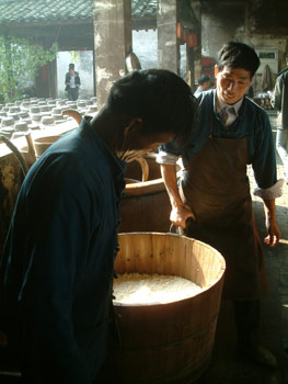 烏鎮的槽坊工人正在用傳統的工藝釀造美酒。