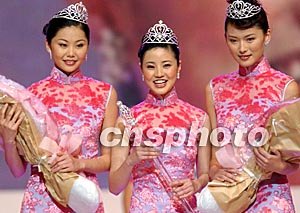 “2003中華小姐環球大賽”總決賽11月8日晚在香港會展中心舉行,圖為來自上海的佳麗江欣榮獲大賽冠軍、吉林佳麗胡古玥(左)獲亞軍、黑龍江佳麗谷雨(右)獲季軍。中新社記者:錢興強