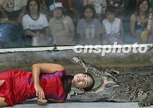 聞名泰國的是拉差公園已成為外國游人的必到之處,周末,美女與鱷魚共同演出時的親近之舉令人心驚。中新社記者:趙振清