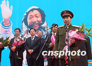 載人航天工程先進事跡報告團一行十三日抵達山城重慶,中國首位航天員楊利偉亦隨團抵達。楊利偉說,重慶是他的第二故鄉,今天他再次感受到了山城人的熱情。圖為楊利偉在重慶舉行的歡迎儀式上致辭。作者:鄒輝