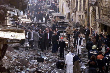 第一起爆炸發生在伊斯坦布爾最大的猶太教會堂外,另外一起爆炸發生在離這座教會堂5公里外的另外一座猶太教會堂。兩座教會堂已經嚴重受損,部分建筑已經倒塌,濃濃的黑煙從現場冒出,到處都是碎玻璃、扭曲變形的金屬。