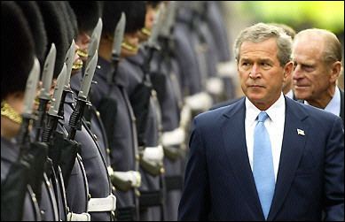 美國總統布什是繼1982年里根訪英以來,第一位正式應伊麗莎白女王之邀到英國進行國事訪問的美國總統!皻g迎”規格創新紀錄,在英國有很多人已提前動起來了:1.4萬名警察嚴陣以待,數十萬反戰人士整裝待發。