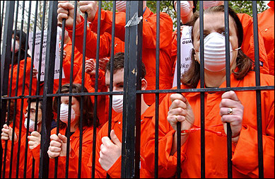 示威者扮成關(guān)塔那摩囚犯的模樣進(jìn)行抗議。