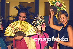 巴西小姐(左二)和葡萄牙小姐(右一)對中國京劇花旦演出的折扇情有獨鐘。中新社記者:廖文靜