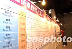 香港特區11月23日舉行區議會選舉,一萬名工作人員在四百二十多個不同的投票站,由早上七時半至晚上十時半為市民服務。圖為工作人員在張貼各區投票率和選舉結果。中新社記者:洪少葵