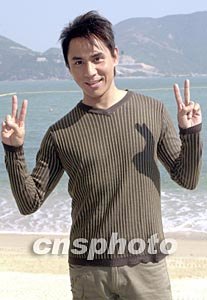 歌星黃凱芹11月26日在香港赤柱正灘為無線電視拍攝音樂劇《愛在富豪海灣的日子》外景,黃凱芹與關心妍拍完一幕親熱戲后,雙手擺出勝利手勢。作者:鄧慶樂