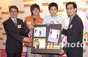 樂壇組合Shine成員黃又南、徐天佑12月2日在香港出席《Kodak數碼沖曬多面睇》記者會,Kodak更設計了一套三款的「Kodak ×Shine 2004慈善相片年歷」予香港世界宣明會作慈善用途。中新社記者:鄧慶樂