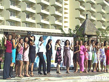參加第五十三屆世界小姐總決賽的佳麗6日下午三時半出征,評委成龍為佳麗們鼓氣。作者:關向東