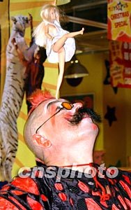 來自俄羅斯的莫斯科馬戲團在香港進行為期數月的演出活動,全新的馬戲節目為香港觀眾帶來歡樂、刺激的新感受。圖為馬戲團小丑為賓客表演雜耍。中新社記者:錢興強