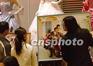 香港圣誕婚紗及結婚用品展十二月十九日在香港會展中心開幕,是次展會是2003年底香港舉辦的最大型的婚紗展,又正值歡度圣誕節之際,展會上結婚用品款式繁多,圖為婚慶公司向參觀者介紹婚紗攝影。中新社記者:錢興強