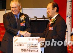 特備展覽“中國首次載人航天飛行展Ⅱ--給香港的禮物”十二月二十三日在香港科學館開幕,圖為何鴻燊博士在展覽開幕儀式上向香港公益金捐款。中新社記者:錢興強