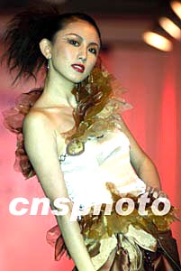 二十四日下午,在二零零三中國國際時裝周獲得大獎的幾位廣東著名服裝設計師在廣州舉辦匯報演出,展示獲獎作品中的一款別致女裝。作者:柯小軍
