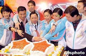 演唱會結束后,Twins與唱片公司高層吳雨及演唱會主辦機構老板張耀榮等人舉行祝捷會切蛋糕。作者:鄧慶樂