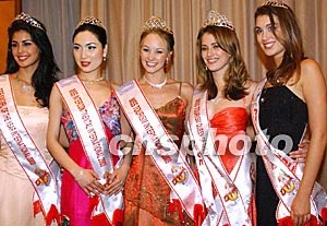 日前,在馬來西亞首都吉隆坡舉行的第八屆國際旅游小姐選美總決賽上共評出五項冠軍,大賽組委會主席向記者闡明,國際旅游小姐選美賽不同其它選美賽事,組委會現持有五項馬來西亞旅游部授權的大賽執照,是次大賽由評判團評出的有五項冠軍桂冠,南非的選手ANGELA BECK獲國際旅游小姐冠軍、希臘小姐獲國際旅游年度皇后冠軍、中國選手邢會原獲世界洲際小姐冠軍、阿根廷選手獲夢幻小姐冠軍、捷克選手獲國際名城小姐冠軍。而且經授權,國際旅游年度皇后和國際名城小姐兩項賽事,已確定2004年分別在中國舉行。曾于2001年參加該賽的中國佳麗閻巍獲得夢幻小姐冠軍,2002年中國佳麗殷子獲得國際旅游年度皇后桂冠。圖為大賽評選出的獲得不同項目的五名冠軍得主。中新社記者:錢興強