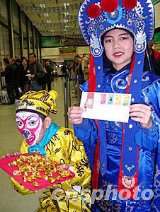 一月四日,香港郵政發行猴年特別郵票,圖為一名年僅十二歲的少年表演變臉助興,并與其父──“美猴王”向市民派發吉祥金元寶以示祝賀。作者:潘索菲