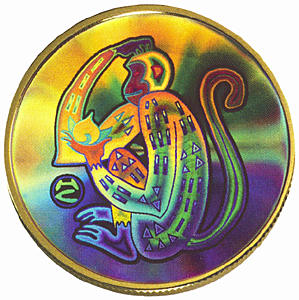 金幣18開金,激光泛彩,幣面彩色全息圖像為左手托仙桃、右手頭部抓癢蹲姿側像,表現了猴俏喜活潑的可愛形象。