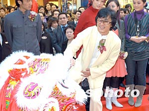 影星成龍1月9日在香港銅鑼灣出席英皇鐘表珠寶分店開幕禮,為助興的醒獅進(jìn)行點(diǎn)睛儀式。中新社記者:鄧慶樂