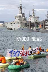 參加游行的25人,分開乘坐13條橡膠船。揭起“絕不允許自衛隊的海外派兵”的橫幅,在可能被派遣的艦艇“國東”的附近舉行海上游行。