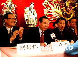 中國國臺辦副主任王在希(左二)十三日抵達紐約與四百多名僑胞見面,非常坦率地闡述了中國政府對臺灣問題的立場和近期的政策,表示中國政府對任何“臺獨”分裂活動都有充分準備,有決心、有能力、有辦法確保國家主權和領土的完整,中國駐紐約總領事劉碧偉(左一)、美東華人社團聯合總會共同主席梁冠軍(左三)等出席了見面會。中新社記者:趙海燕