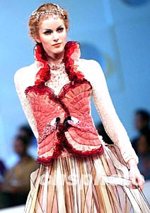香港1月15日舉辦“香港國際時裝設計師表演”專場,圖為模特展示來自加拿大時裝設計師陳慧南的作品。中新社記者:洪少葵