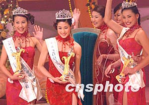 2004年度國際華裔小姐競選決賽一月十七日晚在香港舉行,來自二十一個不同國家和地區(qū)的選手參加了角逐,來自溫哥華的佳麗鐘嘉欣獲得冠軍、香港佳麗曹敏莉(左)獲得亞軍、馬尼拉佳麗洪巧玲獲得季軍。作者:錢興強(qiáng)