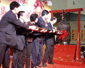 廟會開幕式上,商城總經(jīng)理與顧客一些撞響開幕鐘。甄雪原攝
