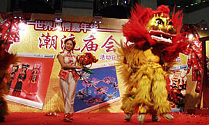 時近春節(jié),以現(xiàn)代潮流著稱的北京東方廣場將中國傳統(tǒng)廟會形式搬入東方新天地商城內(nèi),以營造濃濃的中國民俗風情。圖為商城內(nèi)進行的舞獅表演。甄雪原攝