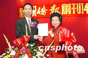 美國《僑報》十七日晚在紐約華埠舉行十四周年報慶,美國總統布什特意給過生日的《僑報》發來新春賀詞。美國聯邦衛生部顧問、全美華裔共和黨聯盟主席蘇麗凰(右)宣讀賀詞后將賀詞交給《僑報》社長范東升。作者:龔文謨