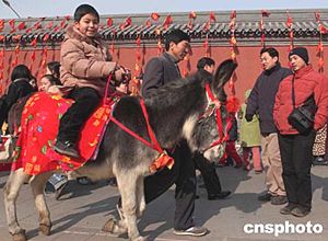 農歷新年伊始,北京白云觀廟會上人頭攢動,一派熱鬧景象,許多兒童騎著小毛驢逛廟會,別有一番情趣。幾百年來,騎驢逛白云觀廟會一直是這里的一大特色。中新社記者:張煒