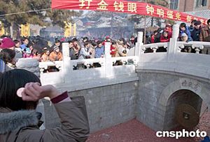 農歷新年伊始,北京白云觀廟會上的傳統民俗活動吸引大批市民。在窩風橋畔,“打金錢眼”的市民不停地向橋下的銅鈴投擲“銅錢”,清脆的撞擊聲不絕于耳。據說,打中銅鈴者不但會吉祥如意,而且“財源滾滾”。中新社記者:張煒