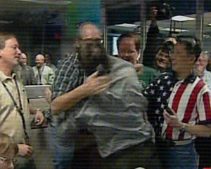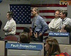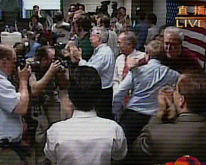 “機遇”號火星探測器成功登陸的信號傳回地球,NASA的項目主要指揮者們興奮相擁。