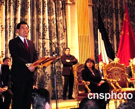 上午十一時(shí)半,在軍樂隊(duì)和儀仗隊(duì)的列隊(duì)引導(dǎo)下,胡錦濤主席健步邁入巴黎市政廳燈火輝煌的節(jié)日大廳,受到巴黎市官員、議員、各國(guó)駐法使節(jié)等一千多各界人士的鼓掌歡迎。