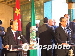 中國外長李肇星與穆薩三十日在開羅舉行記者會,宣布中國和阿拉伯國家合作論壇(中阿合作論壇)自即日起正式成立,中阿雙邊并發(fā)表了《中國——阿拉伯國家合作論壇宣言》。中新社記者:齊彬