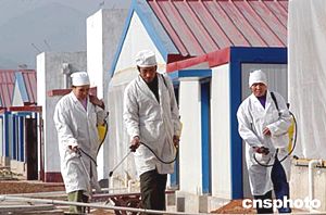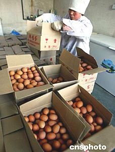 北京一家養雞場的工人對出場雞蛋進行嚴格檢查、檢疫,以確保市民吃上放心蛋。目前,首都工商、衛生等部門加強對市場活禽和相關禽類產品的檢查,以防禽流感。中新社記者:宋吉河