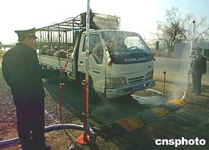 北京市相關執法人員對外地進京車輛進行消毒,以預防禽流感。目前,北京市各相關部門采取積極措施,落實市政府“檢查關口前移,預防重點下移,嚴防死守”的預防禽流感要求。中新社記者:宋吉河