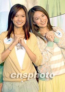 樂壇組合2R兩名成員黃婉君(Roseane)、黃婉佩(Race)(左起)2月4日在香港出席化妝品牌Biotherm《2004呵護皮膚色彩系列色彩大使》記者會,春節期間兩人離港返回新加坡探親,回港后于活動上向大家拜年。作者:鄧慶樂