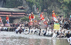 富有濃郁客家風情的羅坊“走古事”,2月5日在“客家祖地”閩西連城縣羅坊鄉舉行,第四屆中國冠豸山客家民俗文化節由此拉開帷幕。羅坊“走古事”系由幾隊人馬各抬一架“古事”(上有一古裝打扮孩童),在陸上、水中爭先前行的民俗活動。作者:黃翔
