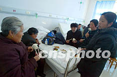 北京密云縣元宵節之夜重大傷亡事件中的受害者家屬,六日忍著悲痛在病床上吃午餐。中新社記者:宋吉河