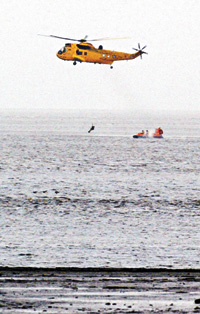英國派出直升機到莫克姆灣海灘海面,搜索拾貝蛤期間被困失蹤的華人(美聯(lián)社)