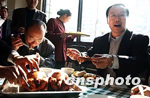記者看到,自助餐區準備的菜不僅有酸辣黃瓜、尖椒皮蛋,蒜蓉油菜,還有涼拌雞胗、宮保雞丁、香炸雞翼、西紅柿雞蛋。杜青林先夾了一些涼拌雞胗和酸辣黃瓜,他說,“平時比較喜歡吃雞肉,所以今天多吃點雞”。一邊說著,一邊往自己的盤子里夾了宮保雞丁、西紅柿雞蛋,最后他還揀了三塊香炸雞翼放在盤中。